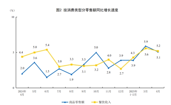 按消費類型分,4月份,商品零售額33007億元,同比增長5.1%;餐飲收入4167億元,增長5.2%。1—4月份,商品零售額143651億元,增長4.7%;餐飲收入18194億元,增長4.8%。