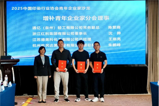 會(huì)上,通億(泉州)輕工有限公司常務(wù)副總陳繁裔、浙江紅利集團(tuán)有限公司董事長(zhǎng)沈驊、江蘇德美科化工有限公司總經(jīng)理王斯亮、杭州航民達(dá)美染整有限公司副總經(jīng)理朱鵬峰4位同志增補(bǔ)為中國(guó)印染行業(yè)協(xié)會(huì)青年企業(yè)家分會(huì)理事,中國(guó)印染行業(yè)協(xié)會(huì)會(huì)長(zhǎng)林琳為新增補(bǔ)理事頒發(fā)聘書。