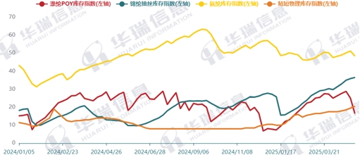 化纖庫存在2024年末較好去化后,一季度大部分子行業(yè)庫存水平低位回升(圖2)。以滌綸長絲為例,春節(jié)后,下游裝置陸續(xù)重啟,但主要以消化節(jié)前備貨原料為主,行業(yè)產(chǎn)銷持續(xù)偏弱,工廠庫存累積;3月以來,下游加彈、織造開機(jī)不及旺季預(yù)期,行業(yè)產(chǎn)銷以階段式脈沖放量為主,工廠庫存總體呈持續(xù)累積。4月下旬,滌綸長絲價(jià)格相對(duì)低位,部分下游投機(jī)備貨,工廠庫存有所去化。分產(chǎn)品看,一季度,滌綸POY平均庫存19天,與2024年同期基本持平;錦綸平均庫存24天,較2024年同期提升7.6天;氨綸平均庫存49天,仍在高位震蕩,庫存壓力較大。