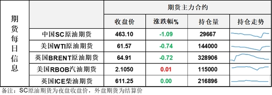 【1】WTI主力原油期貨收跌0.46美元,跌幅0.74%,報(bào)61.57美元/桶;布倫特主力原油期貨收跌0.47美元,跌幅0.72%,報(bào)64.91美元/桶;INE原油期貨收跌1.09%,報(bào)463.1元。