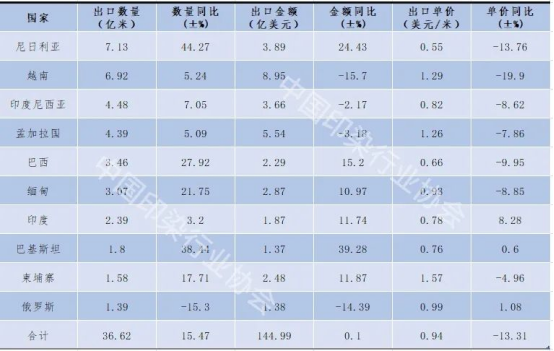 我國(guó)印染行業(yè)對(duì)主要市場(chǎng)的出口呈現(xiàn)量增價(jià)跌態(tài)勢(shì)。一季度,我國(guó)印染八大類產(chǎn)品對(duì)東盟和RCEP貿(mào)易國(guó)出口數(shù)量分別增長(zhǎng)8.59%和8.45%,出口平均單價(jià)分別下滑13.65%和13.14%,降幅均高于行業(yè)出口平均水平。出口數(shù)量排名前十的國(guó)家中,僅對(duì)俄羅斯出口數(shù)量出現(xiàn)下滑,對(duì)其余國(guó)家出口數(shù)量均實(shí)現(xiàn)不同程度增長(zhǎng),其中對(duì)尼日利亞出口數(shù)量同比增幅達(dá)到44.27%,主要得益于當(dāng)?shù)卣掷m(xù)推進(jìn)的一系列改革措施,包括彌補(bǔ)收入流失、強(qiáng)化機(jī)構(gòu)間合作以及推動(dòng)貿(mào)易主體自愿遵守法規(guī)等;對(duì)巴西、緬甸、巴基斯坦出口數(shù)量增速均超過20%。從出口平均單價(jià)來看,對(duì)前十國(guó)家出口單價(jià)平均下降13.31%,其中對(duì)越南出口單價(jià)下降最為明顯,降幅接近20%,對(duì)印度、巴基斯坦和俄羅斯出口單價(jià)有所增長(zhǎng)。