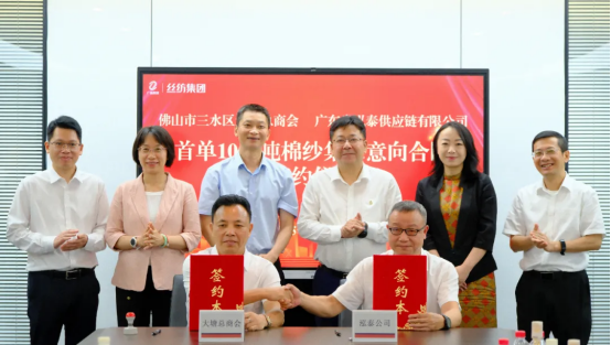 會上,三水區(qū)大塘鎮(zhèn)總商會與絲紡集團所屬企業(yè)泓泰供應(yīng)鏈公司簽訂戰(zhàn)略合作協(xié)議以及首單1000噸棉紗銷售意向合同。