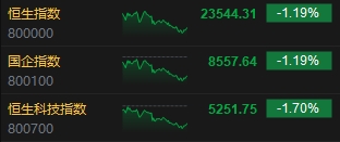 5月22日消息,港股三大指數(shù)低開低走,截至收盤,恒生指數(shù)(23544.311, -283.47, -1.19%)跌1.19%,報23544.31點,恒生科技指數(shù)(5251.75, -90.66, -1.70%)跌1.70%,國企指數(shù)跌1.19%。盤面上,科網(wǎng)股普遍下挫,聯(lián)想集團(9.57, -0.55, -5.43%)跌超5%,百度集團跌超4%,嗶哩嗶哩、阿里巴巴跌超3%,快手、小米集團、網(wǎng)易跌超2%;黃金股分化,大唐黃金(0.215, 0.02, 10.26%)漲超10%;部分藥品股沖高,艾美疫苗(4.15, 0.54, 14.96%)漲近15%。