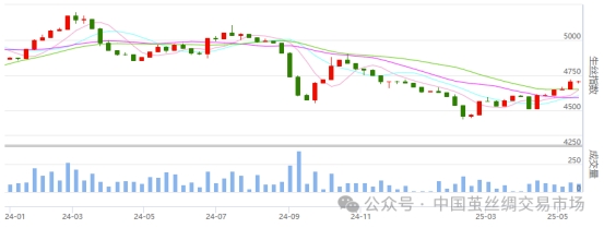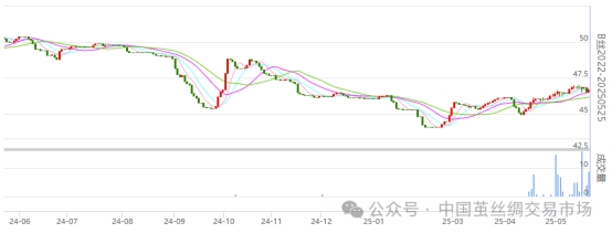 今日(周五)盤面各生絲遠(yuǎn)近合約均小幅收紅。今日是250325生絲合約的最后交易日,終盤收于46.68萬元,今日繼續(xù)增倉,顯示在該價(jià)位附近拿貨與賣貨需求同步有所釋放。本周生絲電子指數(shù)收出紅色十字星,顯示市場多空博弈趨于平衡但整體偏強(qiáng)。