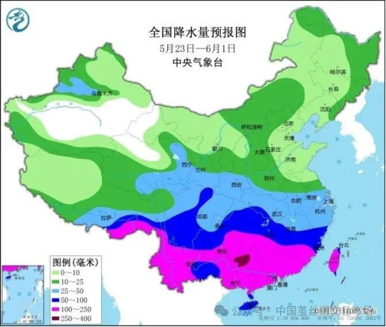 未來10天(5月23日-6月1日),江南、華南及貴州、云南等地累計(jì)降水量有50~100毫米,其中江南南部、華南中西部及云南等地部分地區(qū)有120~200毫米,局地超過250毫米;內(nèi)蒙古中西部、華北西部、西北地區(qū)東南部、黃淮西部等地累計(jì)降水有10~25毫米,局地超過40毫米,上述大部地區(qū)降水量較常年同期偏多3~7成,部分地區(qū)偏多1~2倍,我國其余大部降水較常年同期偏少或接近常年。