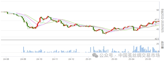今日(2025年05月23日,周五)中國繭絲綢交易市場生絲電子指數(shù)上漲0.32%報(bào)收于4708.78點(diǎn),本周生絲指數(shù)累計(jì)上漲0.02%。B絲2022D(商檢4A級(jí)生絲):250525合約上漲0.12萬元報(bào)收于46.68萬元;250925合約上漲0.15萬元報(bào)收于47.40萬元;260325合約上漲0.24萬元報(bào)收于47.46萬元。
