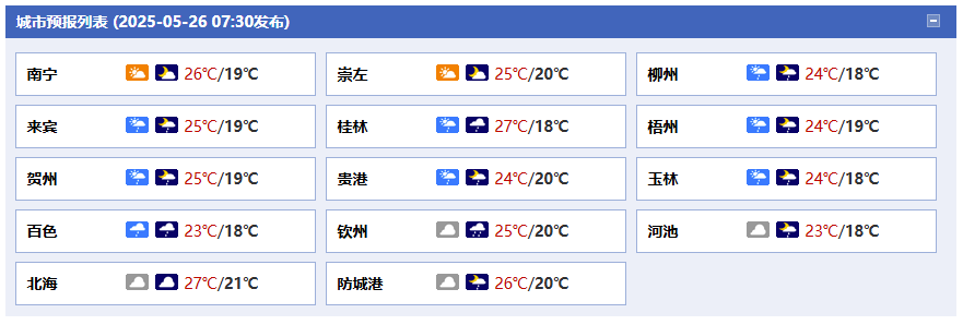 未來三天,廣西仍多降雨天氣。預計今天(26日),全區(qū)大部有陣雨或雷雨天氣,桂北降雨比較明顯,部分地區(qū)有中雨、局地大雨。27日新一輪強降雨過程將開啟,桂北及沿海部分地區(qū)有大雨到暴雨,局地大暴雨并伴有短時雷暴大風等強對流天氣,我區(qū)其它地區(qū)有陣雨或雷雨、局地大雨或暴雨。28日,桂東、桂南部分地區(qū)有暴雨、局地大暴雨到特大暴雨,并伴有短時雷暴大風等強對流天氣,我區(qū)其它地區(qū)有中到大雨、局地暴雨。