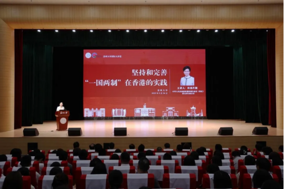 會見后,林鄭月娥在學(xué)校存菊堂以《堅(jiān)持和完善“一國兩制”在香港的實(shí)踐》為題發(fā)表演講。結(jié)合自身履職經(jīng)歷,她系統(tǒng)回顧了“一國兩制”產(chǎn)生的歷史背景和實(shí)踐歷程,從政治、經(jīng)濟(jì)、社會等多個維度論證了“一國兩制”是中國特色社會主義的偉大創(chuàng)舉,是香港保持長期繁榮穩(wěn)定的最佳制度安排。她表示,有“一國兩制”保駕護(hù)航,香港一定能更好地發(fā)揮“背靠祖國,聯(lián)通世界”的優(yōu)勢,積極融入國家發(fā)展大局。講座中,她還介紹了香港打造國際高端人才集聚高地的發(fā)展規(guī)劃及吸引海內(nèi)外人才的具體舉措,誠摯邀請廣大青年學(xué)子赴港學(xué)習(xí)、就業(yè)和發(fā)展,攜手為強(qiáng)國建設(shè)、民族復(fù)興貢獻(xiàn)智慧與力量。