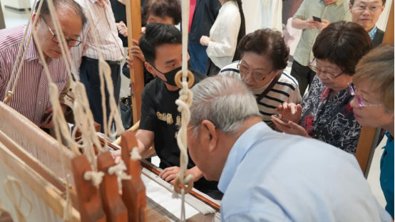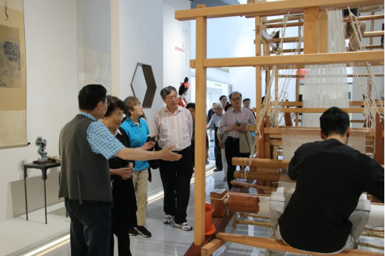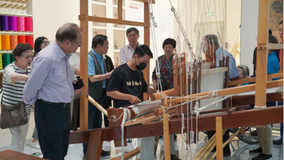 院士專家頗有興趣地觀看了現(xiàn)場用大花樓織機正在古法復(fù)刻的南宋出土的絲織物——星地折枝山茶梅花紋綾作品并與非遺傳承人萬老師做了互動。