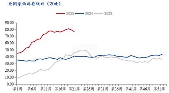 相對豆棕而言,菜油走勢平穩(wěn)的多。鋼聯(lián)統(tǒng)計截止5月23日,全國主要地區(qū)菜油庫存總計76.59萬噸,較上周下跌2.66萬噸,處于近年高位水平。
