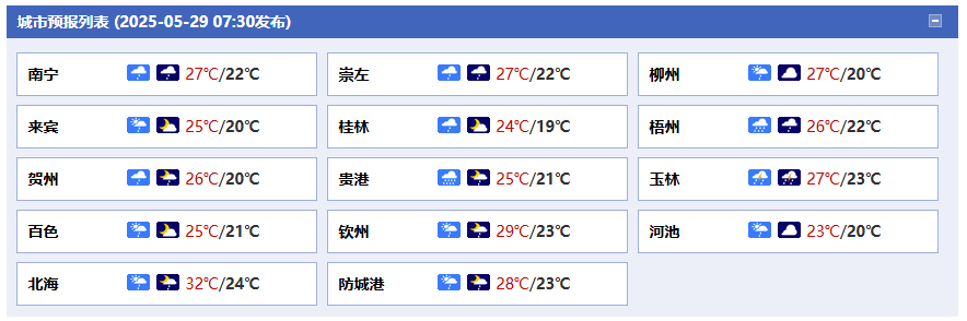 今天白天到晚上,崇左、南寧、貴港、玉林、梧州、賀州、來賓、河池、百色等市及桂林、柳州兩市南部有中到大雨、局地暴雨,其它地區(qū)有小雨、局地中到大雨。提醒大家注意防范強降雨可能引發(fā)的城鄉(xiāng)積澇、中小河流洪水、山洪及地質災害,強降雨期間盡量減少外出,遠離河道、山谷、地勢低洼易澇區(qū)、地質災害易發(fā)區(qū),如居住在易受洪水、山洪及地質災害影響的區(qū)域,務必提前做好撤離準備,遵循當地政府和相關部門發(fā)布的指引和指示,如需疏散或避難,請積極配合;29日白天到晚上廣西大部強降雨趨緩,但是桂南局地仍有大雨或暴雨,30日白天到晚上全區(qū)以多云到陰天為主,偶有陣雨或雷雨,局地也不排除有中到大雨,地質災害具有滯后性,大家仍需保持警惕。