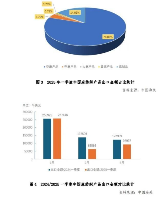 根據(jù)中國(guó)海關(guān)數(shù)據(jù)統(tǒng)計(jì),2025年一季度中國(guó)麻紡織產(chǎn)品出口額4.44億美元,與2024年同比下降16.36%。其中,亞麻纖維紗線面料和麻制品出口金額分別占比78.06%和14.02%。苧麻纖維紗線和面料出口金額占比3.79%,大麻纖維紗線和織物出口金額占比0.75%,黃麻紗線和織物出口金額占比0.76%。見(jiàn)圖3、圖4