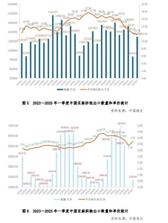 另?yè)?jù)國(guó)家統(tǒng)計(jì)局?jǐn)?shù)據(jù),2025年一季度麻紡織及染整精加工規(guī)模以上企業(yè)生產(chǎn)亞麻布(含亞麻≥50%)6090萬(wàn)米,與2024年同比增長(zhǎng)1.64% ;生產(chǎn)苧麻布(含苧麻≥50%)825萬(wàn)米,與2024年同比增長(zhǎng)3.57%。