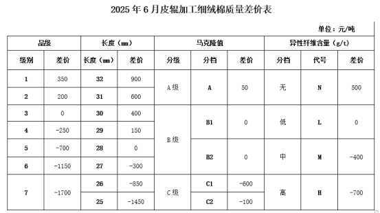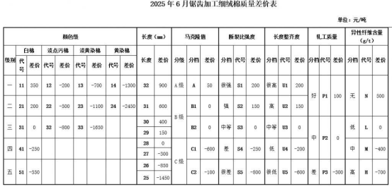 根據(jù)《中國(guó)棉花協(xié)會(huì)國(guó)產(chǎn)棉質(zhì)量差價(jià)表管理辦法》規(guī)定,現(xiàn)正式發(fā)布2025年6月《鋸齒加工細(xì)絨棉質(zhì)量差價(jià)表》、《皮輥加工細(xì)絨棉質(zhì)量差價(jià)表》和《長(zhǎng)絨棉質(zhì)量差價(jià)表》(單位:元/噸)。