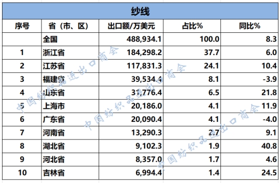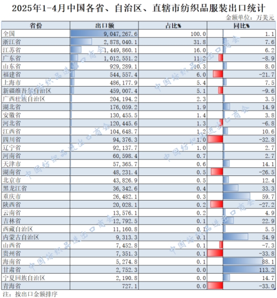 2025年1-4月,我國(guó)紡織服裝累計(jì)出口904.73億美元,同比增長(zhǎng)1.1%。浙江省、江蘇省、廣東省、山東省、福建省分別列全國(guó)紡織服裝出口省市前五位,合計(jì)比重超七成。