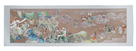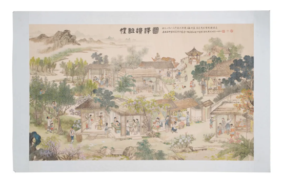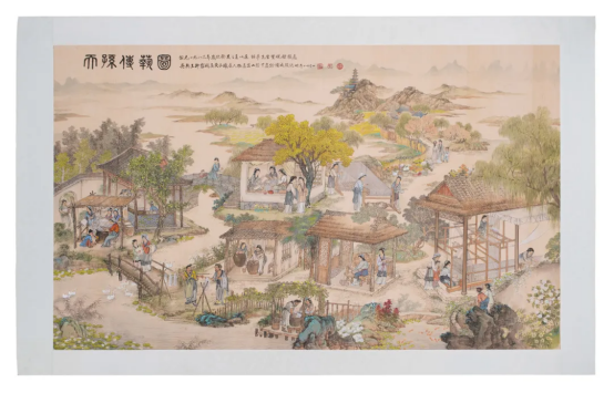 此次捐贈(zèng)為《嫘祖遺澤圖》《天孫傳藝圖》真跡及《群仙祝壽圖》真絲手繡等四件珍貴藏品,其中《嫘祖遺澤圖》和《天孫傳藝圖》為絹本畫(huà),作者為著名畫(huà)家丁慶齡先生、王柳影先生和黃子曦先生,作品取材自南北朝時(shí)期有關(guān)黃帝正妻嫘祖西陵氏被尊奉為蠶神“先蠶”的傳說(shuō)和天孫娘娘,即織女傳授人間絲綢製造技術(shù)的傳說(shuō)。兩幅著作以精湛的畫(huà)技和對(duì)中國(guó)傳統(tǒng)養(yǎng)蠶繅絲技藝、織造技藝的精通,生動(dòng)展現(xiàn)了古代養(yǎng)蠶、繅絲、紡織的全過(guò)程,具有極高的歷史與藝術(shù)價(jià)值。