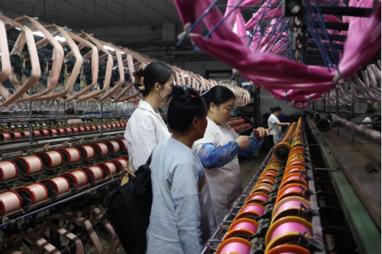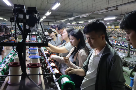 隨后,王國夫總經(jīng)理陪同學員走進公司生產(chǎn)車間,實地觀摩絲綢織造的全流程生產(chǎn)工藝。學員們依次參觀了絡絲、并絲、捻絲、整經(jīng)、織造、檢驗出貨等完整的生產(chǎn)工序。參觀過程中,學員們就織造工藝的創(chuàng)新與傳承、產(chǎn)品質(zhì)量控制等話題與王國夫總經(jīng)理進行了深入交流。特別對公司在保持傳統(tǒng)工藝精髓的同時,如何通過技術(shù)改造提升生產(chǎn)效率等問題展開了熱烈討論。據(jù)介紹,特欣織造秉承傳統(tǒng)絲綢織造技藝,主要生產(chǎn)各類真絲綢緞產(chǎn)品。其產(chǎn)品線豐富多樣,既有純真絲面料,也有絲與氨綸包覆的彈力面料,以及絲與棉、麻等天然纖維的交織面料,充分滿足了市場對高品質(zhì)絲綢產(chǎn)品的多元化需求。