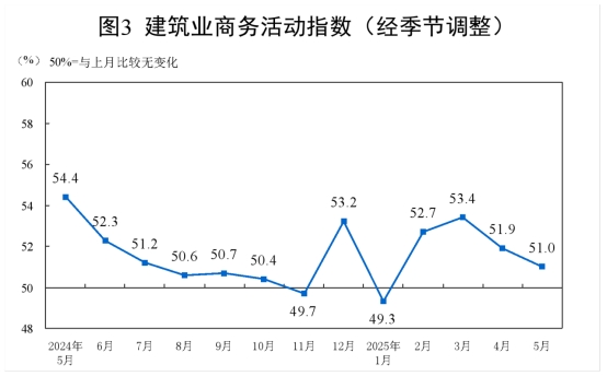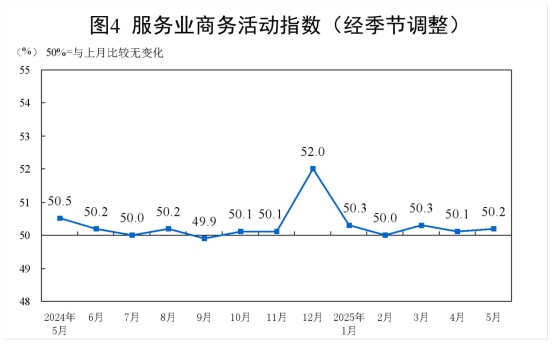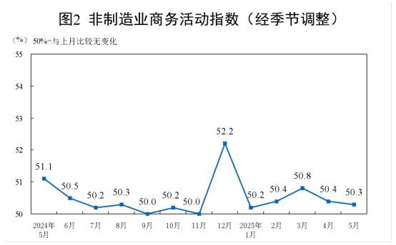 5月份,非制造業(yè)商務(wù)活動(dòng)指數(shù)為50.3%,比上月下降0.1個(gè)百分點(diǎn),仍高于臨界點(diǎn),非制造業(yè)總體延續(xù)擴(kuò)張。