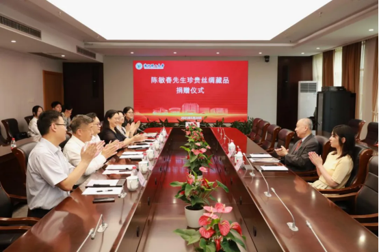 5月28日上午,陳敏春先生珍貴絲綢藏品捐贈(zèng)儀式在浙江理工大學(xué)行政樓308會(huì)議室舉行。FNT基金會(huì)主席、香港寶通華行有限公司董事陳敏春,浙江理工大學(xué)黨委副書記繆魯加,校黨委委員、黨委宣傳部部長高麗靜,杭州宇稱電子技術(shù)有限公司文物成像部主任侯然等出席儀式。儀式前,浙江理工大學(xué)黨委書記趙全軍會(huì)見了陳敏春先生一行。