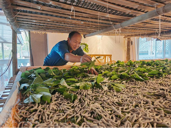 這個森林覆蓋率達(dá)90.3%的滇西鄉(xiāng)鎮(zhèn),年均溫穩(wěn)定在20℃,是天然的蠶場。三年前,鄉(xiāng)黨委政府將蠶桑定為鄉(xiāng)村振興主導(dǎo)產(chǎn)業(yè),如今已培育出完整產(chǎn)業(yè)鏈。平地村黨總支書記楊枝良指著新擴(kuò)建的蠶房介紹,去年20多戶跟著養(yǎng)蠶,戶均產(chǎn)繭70公斤,每公斤67元的保底價,讓農(nóng)戶輕輕松松進(jìn)賬七八千元。