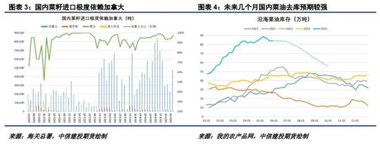 6月10日即將實施的保稅區(qū)監(jiān)管新規(guī)引發(fā)近期企業(yè)洗船,根據(jù)我們的了解, 6月后國內(nèi)菜籽到港僅剩零星幾條。在此背景下,即便中加關(guān)系能在后期獲得實質(zhì)性改善,在2025/26年度加菜籽新作上市供應(yīng)前,我們預(yù)計國內(nèi)菜籽供應(yīng)也較難獲得明顯改善。加菜籽新作在8-9月收割后,運到中國并通關(guān)壓榨,至少也得到10月。在當前俄羅斯菜油也已進入出口季末的情況下,未來幾個月國內(nèi)菜油去庫的傾向依然較強。隨著菜油市場擔憂情緒釋放,這預(yù)計將逐步對菜油期價帶來支撐,關(guān)注菜油09合約在9000附近的支撐表現(xiàn)。