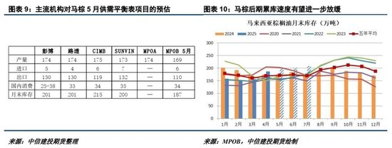 然而,短期棕櫚油漲勢受到馬棕5月進一步累庫的制約。盡管馬棕5月階段性產(chǎn)量增幅持續(xù)縮窄,在上月高基數(shù)的產(chǎn)量下,目前主流機構(gòu)預(yù)估的馬棕5月產(chǎn)量仍高達174萬噸左右,即便出口環(huán)比大幅增長至130萬噸附近,馬棕5月末庫存仍有望攀升至200萬噸以上,這對MPOB月報前的棕櫚油走勢帶來打壓。不過,在國際豆棕價差修復(fù),且印度植物油補庫有望提振產(chǎn)地出口的背景下,我們預(yù)計馬棕后期累庫速度將進一步放緩,這將限制棕櫚油價格在當前位置的進一步下跌幅度。