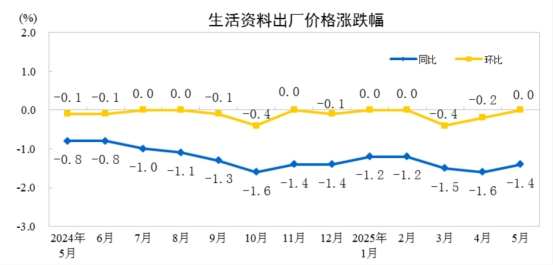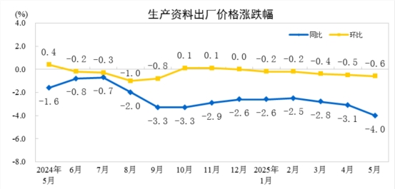 2025年5月份,全國(guó)工業(yè)生產(chǎn)者出廠價(jià)格同比下降3.3%,環(huán)比下降0.4%;工業(yè)生產(chǎn)者購(gòu)進(jìn)價(jià)格同比下降3.6%,環(huán)比下降0.6%。1—5月平均,工業(yè)生產(chǎn)者出廠價(jià)格和購(gòu)進(jìn)價(jià)格比上年同期均下降2.6%。