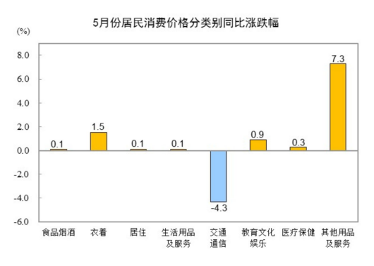 其他七大類價格同比六漲一降。其中,其他用品及服務(wù)、衣著、教育文化娛樂價格分別上漲7.3%、1.5%和0.9%,醫(yī)療保健、居住、生活用品及服務(wù)價格分別上漲0.3%、0.1%和0.1%;交通通信價格下降4.3%。