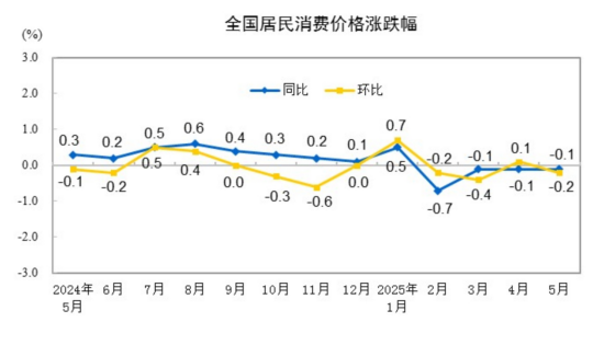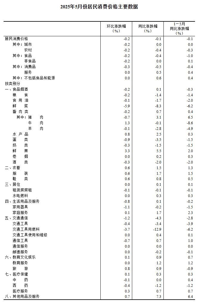 2025年5月份,全國居民消費價格同比下降0.1%。其中,城市持平,農(nóng)村下降0.4%;食品價格下降0.4%,非食品價格持平;消費品價格下降0.5%,服務(wù)價格上漲0.5%。1—5月平均,全國居民消費價格比上年同期下降0.1%。