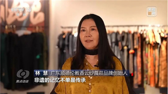 廣東順德倫教香云紗莨莊品牌創(chuàng)始人 林慧:非遺的記憶不單是傳承,而是堅守在文化根脈的基礎上,用創(chuàng)新的視角做更多融合時尚基因的設計。我們通過很多當代藝術(shù)IP印染到香云紗面料上面,然后達到品牌的文化屬性。