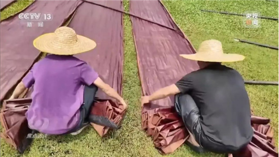 宋錦并非一枝獨秀,近幾年來,越來越多的傳統(tǒng)面料制成的“新中式”風格服裝走到了時尚舞臺的中央,受到了年輕人的追捧。在廣東順德倫教曬莨廠,老手藝人陳洪發(fā)父子帶著工人們正在搶收草地上的香云紗。
