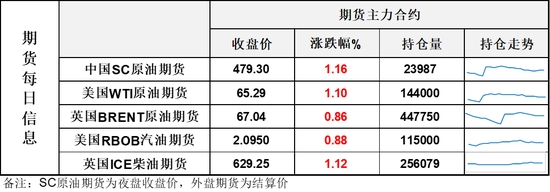 【1】WTI主力原油期貨收漲0.71美元,漲幅1.1%,報65.29美元/桶;布倫特主力原油期貨收漲0.57美元,漲幅0.86%,報67.04美元/桶;INE原油期貨收漲1.16%,報479.3元。