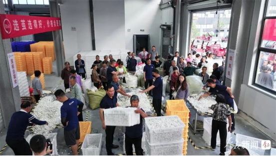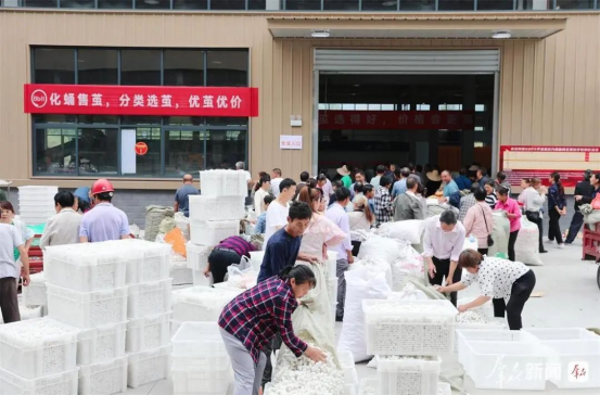 6月5日,在石泉縣池河鎮(zhèn)蠶繭交易智能化收烘中心,蠶農(nóng)和工作人員正在整理選繭。