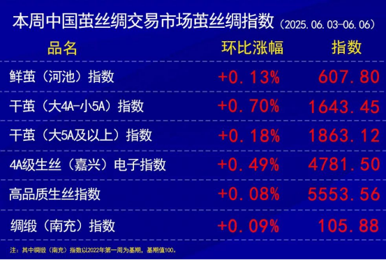 今日(2025年06月06日,周五)中國(guó)繭絲綢交易市場(chǎng)生絲電子指數(shù)上漲0.56%報(bào)收于4781.50點(diǎn),本周生絲指數(shù)累計(jì)上漲0.49%。B絲2022D(商檢4A級(jí)生絲):250625合約上漲0.09萬(wàn)元報(bào)收于47.22萬(wàn)元;250925合約上漲0.45萬(wàn)元報(bào)收于48.18萬(wàn)元;260325合約上漲0.33萬(wàn)元報(bào)收于48.45萬(wàn)元。