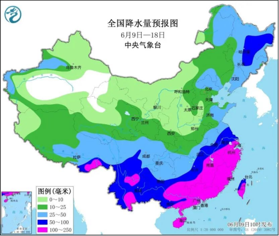天氣上,根據(jù)中國氣象,未來10天(6月9-18日),主要降雨區(qū)位于江漢南部、江淮、江南、華南、川西高原南部及云南、貴州南部、西藏東南部等地,累計降雨量有50~110毫米,其中浙江、江西、福建、廣東等地的部分地區(qū)有130~180毫米,局地超過200毫米。另外,新疆西部、內(nèi)蒙古東部、東北地區(qū)等地累計降水量有15~40毫米,東北地區(qū)東部的部分地區(qū)有50~70毫米。與常年同期相比,江南東北部、華南、云南、東北地區(qū)大部等地降水量偏多2~6成,局地偏多1倍左右。