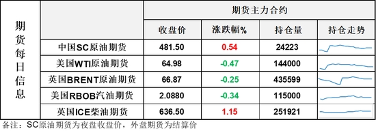 【1】WTI主力原油期貨收跌0.31美元,跌幅0.47%,報64.98美元/桶;布倫特主力原油期貨收跌0.17美元,跌幅0.25%,報66.87美元/桶;INE原油期貨收漲0.54%,報481.5元。