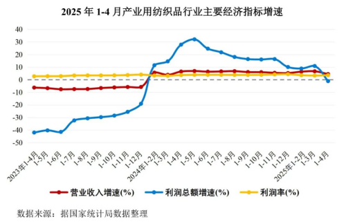 2025年1-4月,全球經濟延續(xù)分化態(tài)勢、下行壓力顯著增強,美國單邊貿易壁壘與地緣政治風險形成疊加效應,加劇國際市場的不確定性;國內政策持續(xù)發(fā)力,降準降息并推出增量措施穩(wěn)定預期,內需市場展現(xiàn)韌性支撐。我國產業(yè)用紡織品行業(yè)運行總體平穩(wěn),工業(yè)增加值同比保持增長。