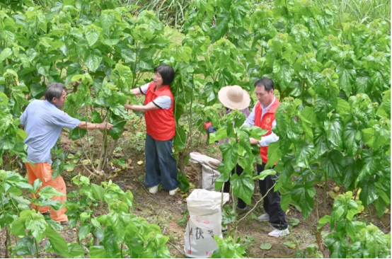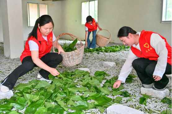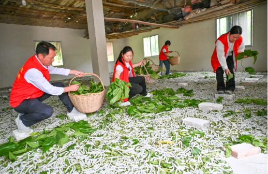 6月5日,岳西縣菖蒲鎮(zhèn)轉(zhuǎn)橋村黨員志愿者幫蠶農(nóng)摘桑葉