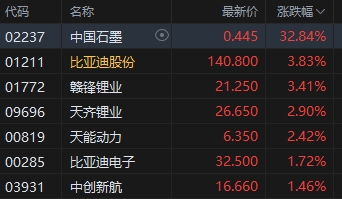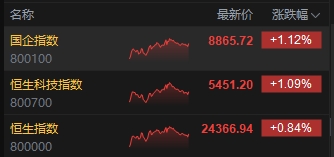 6月11日消息,港股三大指數(shù)震蕩走高。截至收盤(pán),恒生指數(shù)(24366.941, 204.07, 0.84%)漲0.84%,報(bào)24366.94點(diǎn),恒生科技指數(shù)(5451.2, 59.01, 1.09%)漲1.09%,國(guó)企指數(shù)漲1.07%。盤(pán)面上,科網(wǎng)股普漲,嗶哩嗶哩漲近10%,網(wǎng)易漲超2%,阿里巴巴、京東集團(tuán)、聯(lián)想集團(tuán)(9.35, 0.15, 1.63%)、小米集團(tuán)、快手漲超1%;中資券商股全線上揚(yáng),廣發(fā)證券(12.74, 0.74, 6.17%)漲超6%;稀土概念大漲,中國(guó)稀土(0.91, 0.14, 18.18%)漲超18%;汽車、鋰電池股走強(qiáng),中國(guó)石墨(0.445, 0.11, 32.84%)大漲超32%,比亞迪漲近4%;泡泡瑪特(269.8, 11.00, 4.25%)漲超4%。
