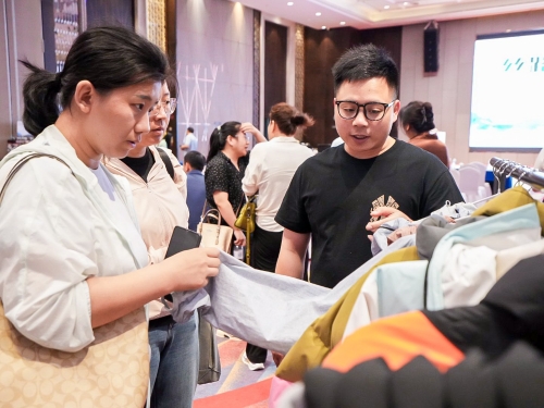 倚信紡織則帶來了“柔性凸版印花工藝”運動服和“極御”戶外運動羽絨系列。其運動服運用“柔性凸版印花工藝”與防偽級精細印花技術,0.01mm超精細激光雕刻制版突破印染極限,精準供墨系統(tǒng)降低染料用量,同時提升色牢度與畫面表現(xiàn)力?!皹O御”戶外運動羽絨系列,則采用高密度三防科技面料,踐行“功能即美學”理念,保持超輕克重與高透氣性,實現(xiàn)全天候防護與場景無界切換。先進的工藝與時尚的產品,成功吸引了現(xiàn)場眾多服裝品牌的目光,大家紛紛主動前來對接洽談合作。