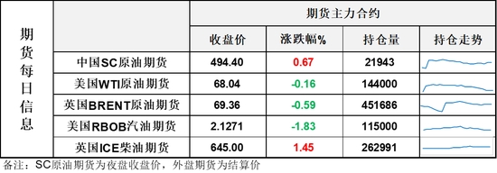 【1】WTI主力原油期貨收跌0.11美元,跌幅0.16%,報(bào)68.04美元/桶;布倫特主力原油期貨收跌0.41美元,跌幅0.59%,報(bào)69.36美元/桶;INE原油期貨收漲0.67%,報(bào)494.4元。