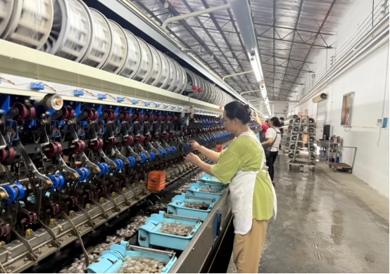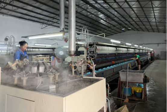 走進(jìn)生產(chǎn)車間,選繭區(qū)的工人正專注地俯身于工作臺(tái),指尖在雪白的蠶繭堆中快速翻動(dòng);煮繭機(jī)內(nèi),恒溫蒸汽將蠶繭軟化至最佳繅絲狀態(tài);自動(dòng)繅絲機(jī)通過(guò)對(duì)繭量、水流、溫度等因素的合理控制和調(diào)節(jié),正在高速繅絲;復(fù)搖機(jī)上,經(jīng)過(guò)初繅的生絲被再次加工,形成均勻光潔的成品絲束……設(shè)備運(yùn)轉(zhuǎn)的嗡鳴聲中,工人們穿梭其間,一場(chǎng)傳統(tǒng)蠶繭與現(xiàn)代機(jī)械的交響曲正在上演。