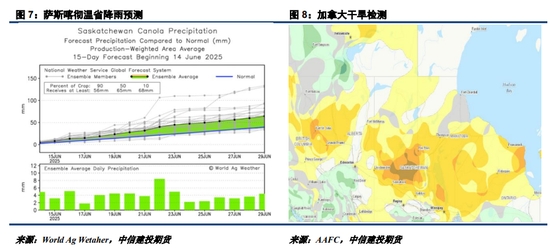 未來半個月,加菜籽主產區(qū)有望獲得有利降水,土壤墑情改善概率較高。但客觀來說,2025年上半年,加菜籽底墑偏差,前期降雨不足,薩斯喀徹溫省等部分產區(qū)確實有干旱跡象。未來1個月,加菜籽即將進入天氣敏感階段,我們整體不推薦在當前時間窗口空配菜系油粕合約。