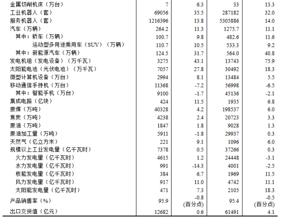 分產(chǎn)品看,5月份,規(guī)模以上工業(yè)623種產(chǎn)品中有326種產(chǎn)品產(chǎn)量同比增長(zhǎng)。其中,鋼材12743萬噸,同比增長(zhǎng)3.4%;水泥16500萬噸,下降8.1%;十種有色金屬683萬噸,增長(zhǎng)2.9%;乙烯303萬噸,增長(zhǎng)14.4%;汽車264.2萬輛,增長(zhǎng)11.3%,其中新能源汽車124.5萬輛,增長(zhǎng)31.7%;發(fā)電量7378億千瓦時(shí),增長(zhǎng)0.5%;原油加工量5911萬噸,下降1.8%。