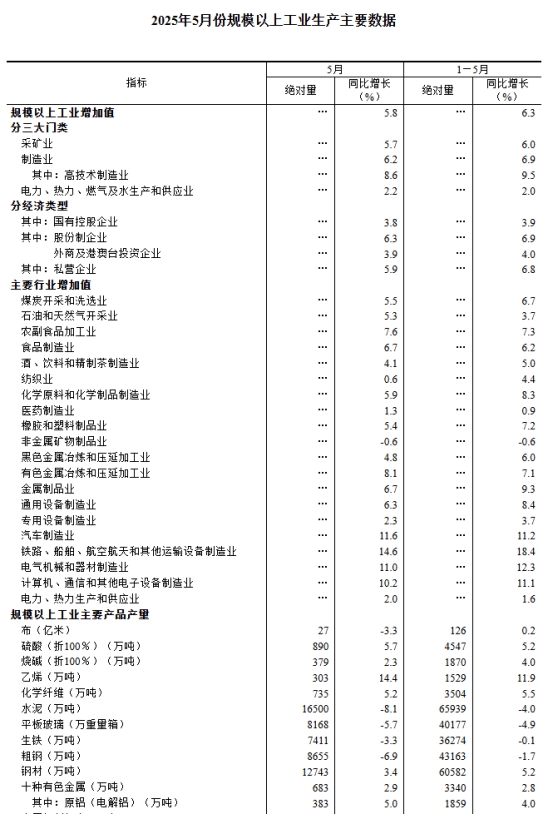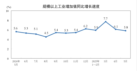 5月份,規(guī)模以上工業(yè)增加值同比實(shí)際增長(zhǎng)5.8%(增加值增速均為扣除價(jià)格因素的實(shí)際增長(zhǎng)率)。從環(huán)比看,5月份,規(guī)模以上工業(yè)增加值比上月增長(zhǎng)0.61%。1—5月份,規(guī)模以上工業(yè)增加值同比增長(zhǎng)6.3%。