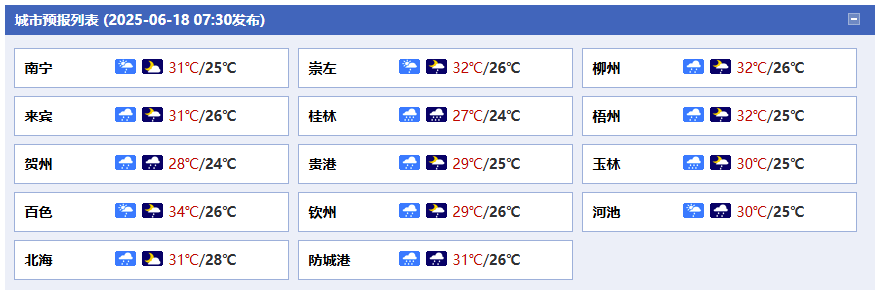 南寧市:今天白天到晚上,中雨、局部大雨或暴雨,偏南風2~3級,最高氣溫31℃,最低氣溫25℃。