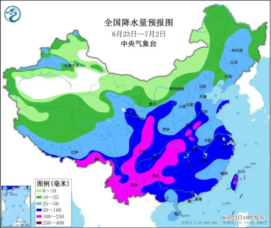 未來10天(6月23日-7月2日),主要降雨區(qū)位于西南地區(qū)、江漢、黃淮、江南北部和西部、華南及西藏東部等地,累計(jì)降水量有60~140毫米,部分地區(qū)有160~230毫米。西北地區(qū)中東部、華北、東北等地累計(jì)降水量有20~40毫米,局地超過70毫米。與常年同期相比,西北地區(qū)東部、華北西部和南部、西南地區(qū)等地降水量偏多2~7成,局地偏多1倍左右,全國其他大部地區(qū)降水量偏少。