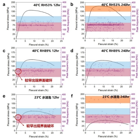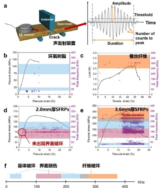 聲發(fā)射測(cè)試(AE)是一種無損檢測(cè)技術(shù),通過實(shí)時(shí)監(jiān)測(cè)聲波頻率、幅值等信號(hào),判斷復(fù)材的失效機(jī)制。團(tuán)隊(duì)對(duì)純環(huán)氧樹脂、蠶絲纖維以及兩種不同厚度的干燥SFRPs試樣進(jìn)行聲發(fā)射測(cè)試(圖3),獲得了基體破壞、纖維斷裂、界面破壞三種失效機(jī)制的特征頻率范圍。