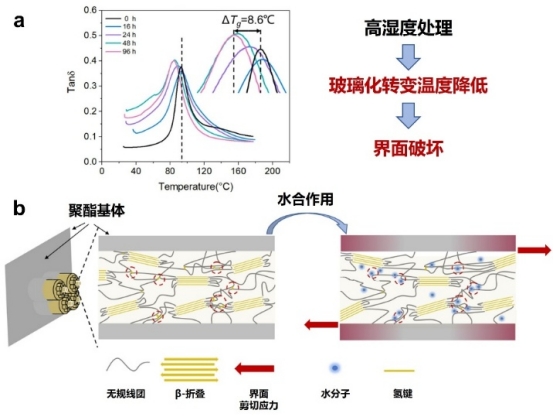 如圖5,中、高濕度處理SFRPs的動(dòng)態(tài)機(jī)械熱分析(DMA)結(jié)果表明,樹脂基體的玻璃化轉(zhuǎn)變溫度均顯著降低,暗示水合作用軟化了基體并且破壞了樹脂與纖維的界面作用。蠶絲纖維的水合作用體現(xiàn)在非晶區(qū)的吸水塑化,而環(huán)氧樹脂因高度交聯(lián)疏水,基本不吸水溶脹。蠶絲和樹脂的水合作用差異將引發(fā)界面剪切應(yīng)力,對(duì)于低濕度條件,界面應(yīng)力或可修復(fù)缺陷,提升屈服強(qiáng)度;但對(duì)于中、高濕度條件(40℃,89%相對(duì)濕度),界面應(yīng)力將損傷纖維與基體界面。