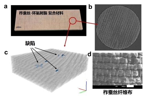 CT及SEM圖像(圖 1)顯示,柞蠶絲織物與環(huán)氧樹脂經(jīng)真空輔助樹脂灌注(VARI)及熱壓工藝制備的SFRPs樣品,其孔隙率低至<0.03vol%,微觀結(jié)構(gòu)致密有序。